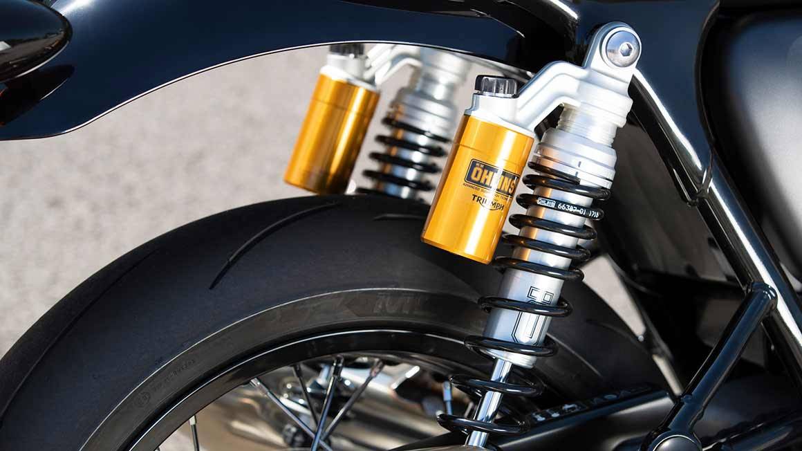 | Seat height: | 785 mm | Rear suspension: | Fully adjustable Öhlins twin shocks with Piggyback reservoir, 120 mm rear wheel travel |
